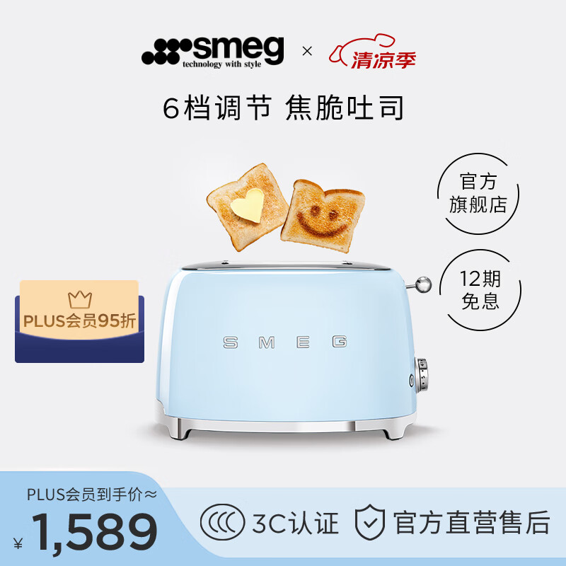 SMEG斯麦格 面包机营养早餐 家用多功能多士炉 烤三明治烘焙面包片吐司机 TSF01 生日礼物 蓝色价格:1859.00元!
