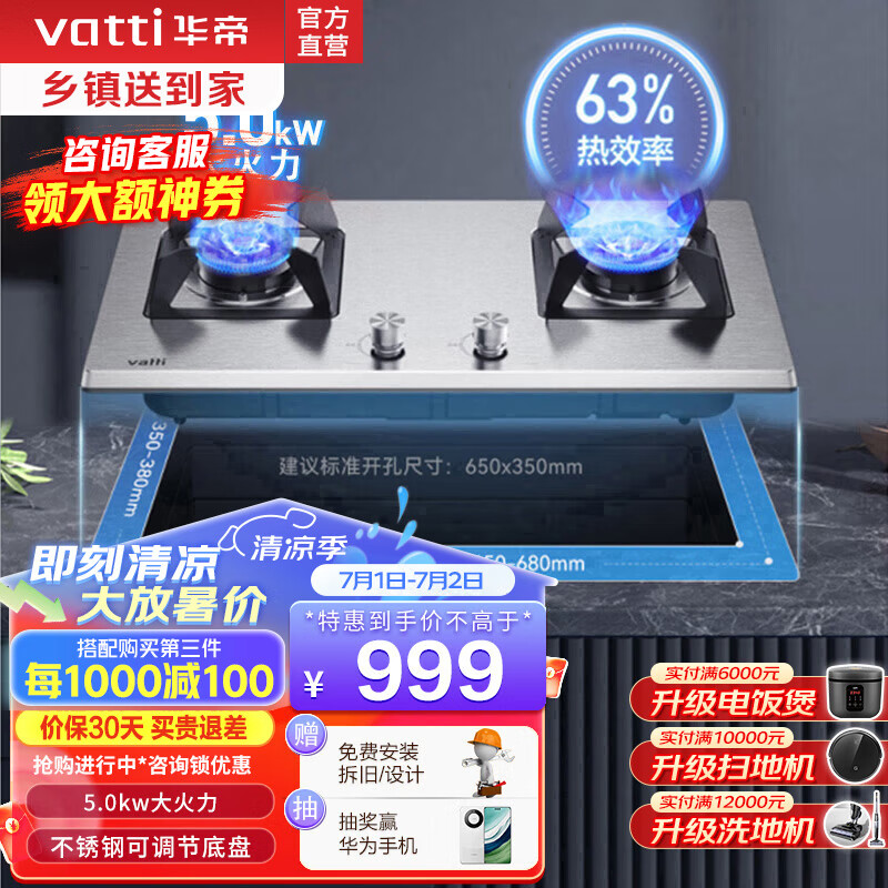 华帝(VATTI)家用燃气灶官方i10065A家用不锈钢燃气灶5.0kw大火力台嵌两用双炉头一级能效可调节安装尺寸 燃气灶 液化气价格:999.00元!