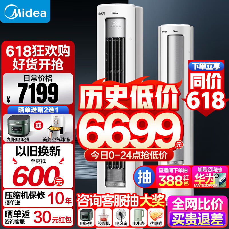 美的大3匹 新一级能效 静优风柜机变频冷暖两用客厅空调大风量家用大风口强劲风商用餐厅方形立式空调价格:6699.00元!