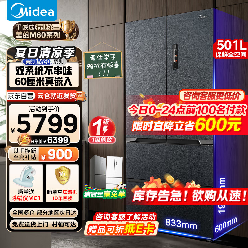美的(Midea)M60超薄系列501升法式多门电冰箱零嵌入式变频家用双系统双循环大容量风冷冰箱MR-526WUFPZE[热销]价格:6399.00元!