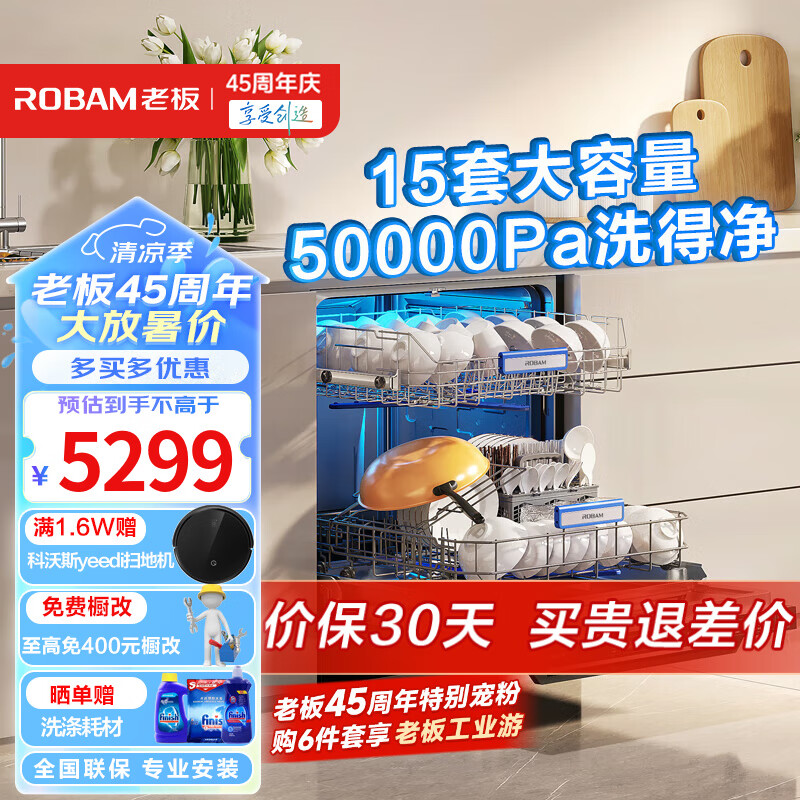 老板(Robam)洗碗机F80X家用15+1套大容量嵌入式洗碗机【李佳琦同款】热风烘干消杀168h存储独立式上下分层洗 【黑色】洗消一体洗碗机 九臂三叉喷淋洗价格:5299.00元!