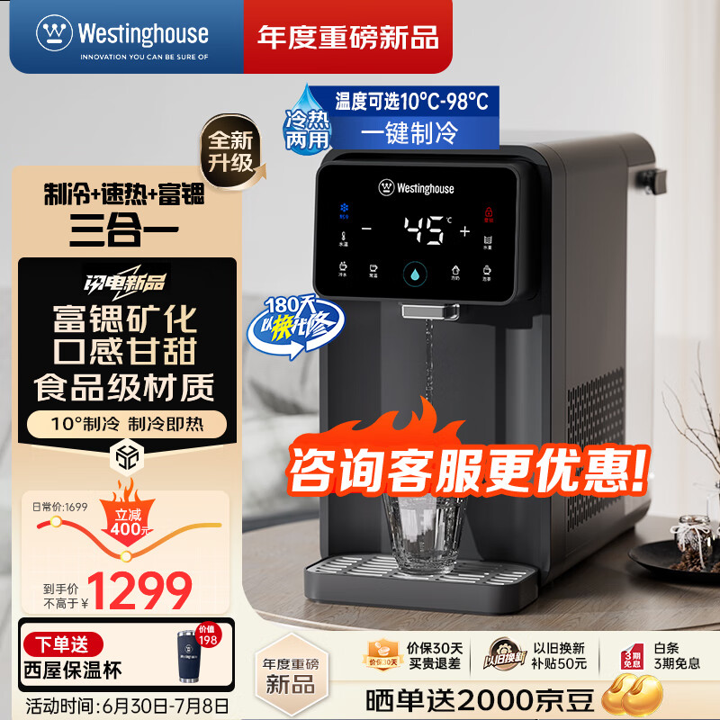 西屋(Westinghouse)即热式饮水机 桌面台式家用小型冷热直饮一体机制冷+制热高端客厅用WFH40-Y3001价格:1299.00元!