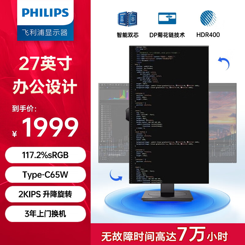 飞利浦(PHILIPS)27英寸 办公显示器 2K 原厂LGD-IPS TypeC65W HDR400 旋转升降 智能双芯 音箱 电脑显示屏276P1FR价格:1999.00元!