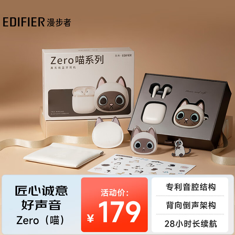 漫步者(EDIFIER)Zero 喵 喵系列限定主题礼盒 真无线蓝牙耳机 半入耳式耳机 无线耳机 节日生日礼物礼盒 暹罗喵价格:179.00元!