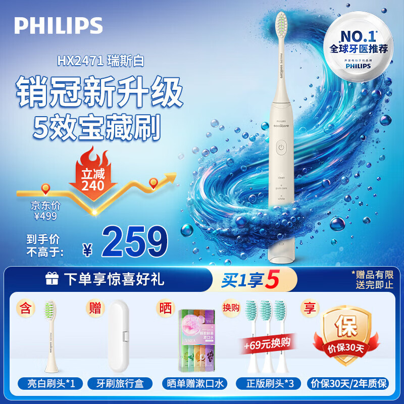 飞利浦(PHILIPS)电动牙刷S3成人情侣款送女友/男友生日礼物 5种模式 软毛柔和亮白刷头 5效宝藏刷 瑞斯白 HX2471/03价格:499.00元!
