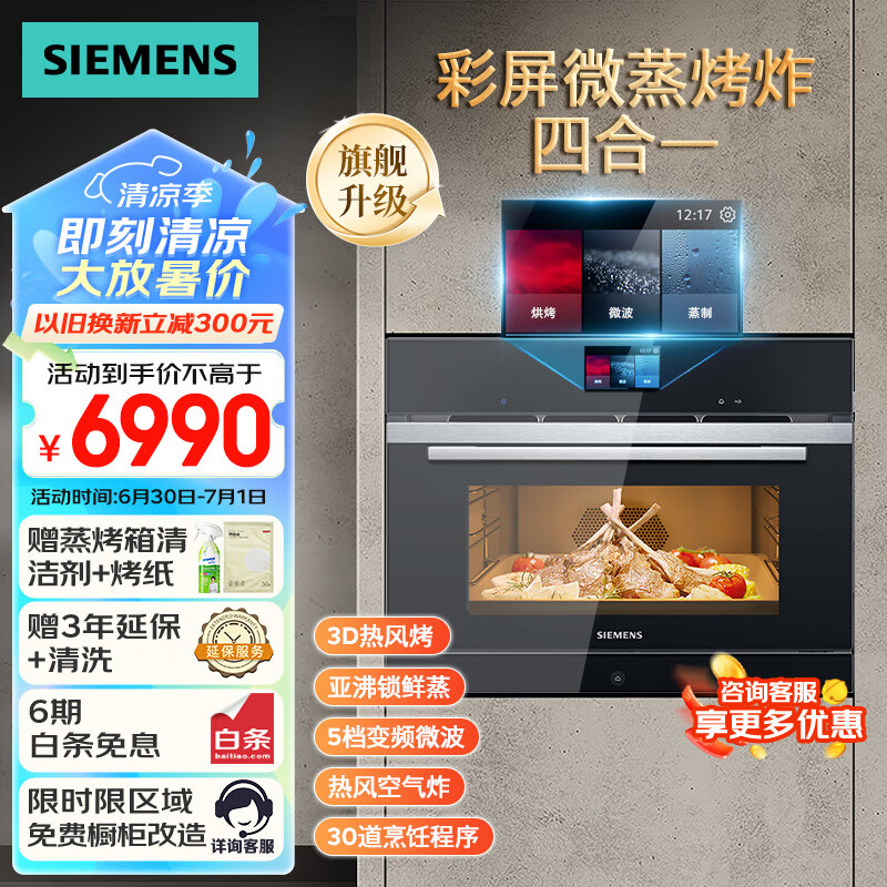 西门子(SIEMENS)36L彩屏微蒸烤炸一体机嵌入式 蒸箱 烤箱 智能微波 家用微蒸烤炸四合一 蒸烤箱一体机 CP269AGS0W价格:6990.00元!
