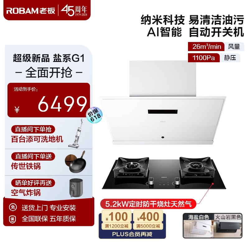 老板(Robam)老板盐系抽油烟机家用大吸力26风量侧吸烟机灶具燃气灶烟灶联动套装26A1-G1+51B0A(天然气)海盐白价格:7099.00元!