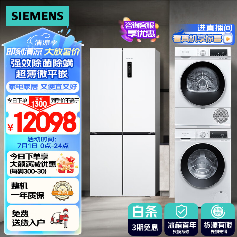 西门子(SIEMENS)冰洗烘套装 497升冰箱+10kg洗衣机+10kg烘干机 KC502080EC+WG52A100AW+WQ53A2D00W价格:13418.00元!
