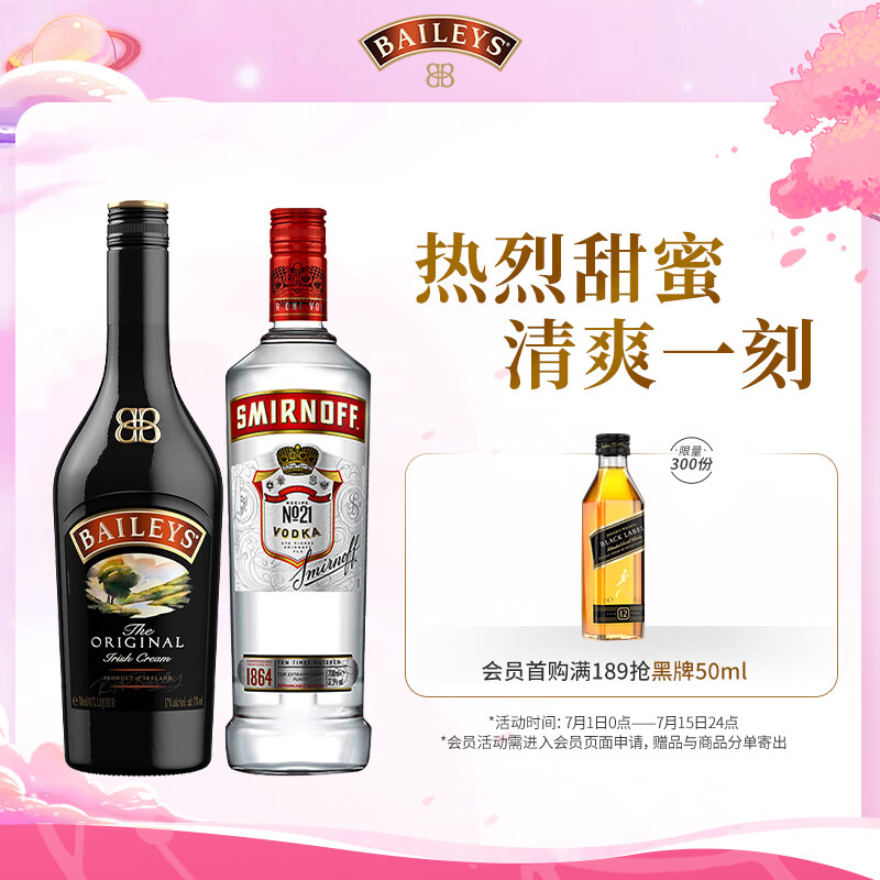 百利(Baileys)甜酒 力娇酒利口酒 奶酒 原味500ml+斯米诺红牌基酒伏特加700ml价格:115.00元!