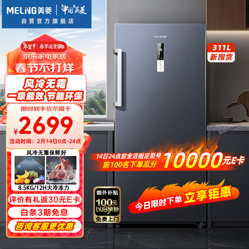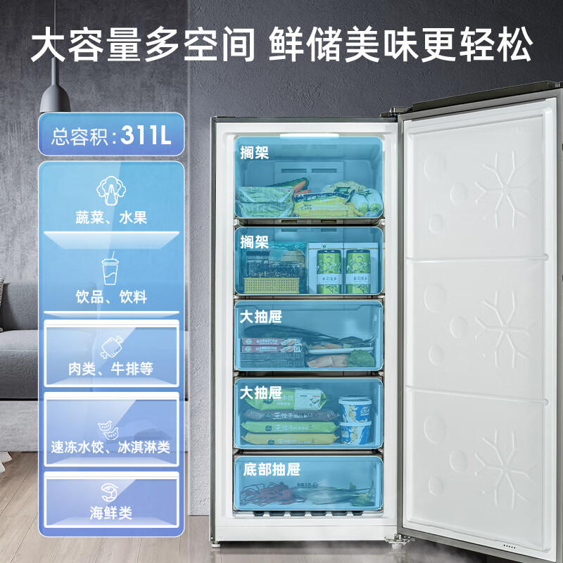 美菱(MELING)311升立式冷冻速冻小型冰柜 家用客厅分区抽屉冷柜一级能效风冷无霜小冰箱 BD-311WPC价格:2699.00元!