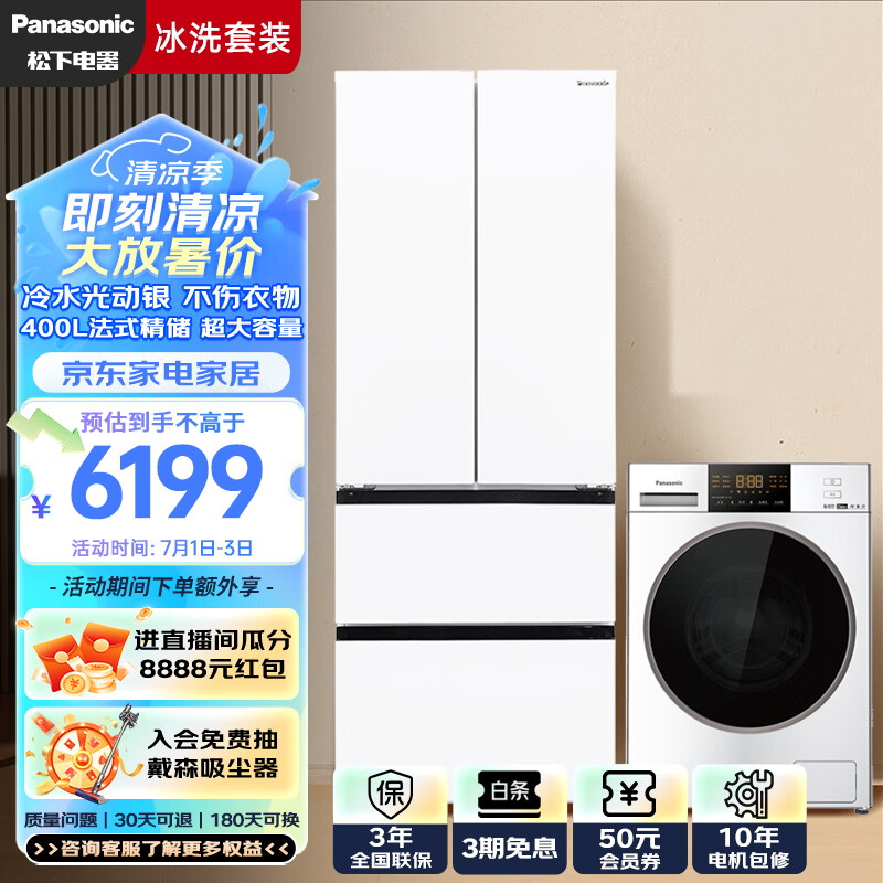 松下(Panasonic)冰洗套装 10kg滚筒洗衣机1.1洗净比 光动银 泡沫净+400升四门法式冰箱 风冷无霜 3E1AK+JD40WSA-W价格:6859.00元!