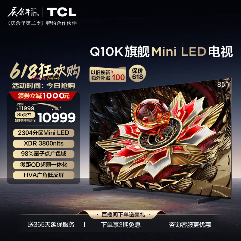TCL电视 85Q10K 85英寸 Mini LED 2304分区 XDR 3800nits QLED量子点 超薄 4K 平板电视机 以旧换新 85英寸价格:13399.00元!