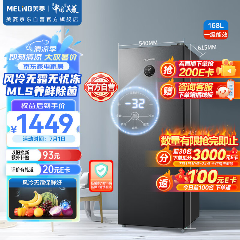 美菱(MeiLing)168升风冷无霜家用立式冰柜母乳冷藏柜冷冻柜转换抽屉式冷柜-32℃速冻小型全冷冻冰箱BD-168WEC灰价格:1549.00元!