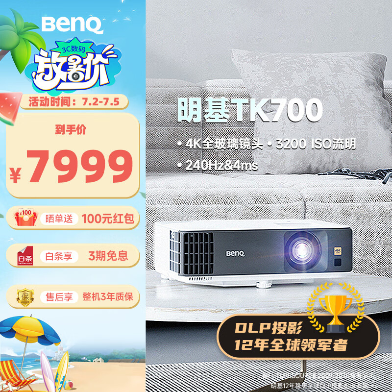 明基(BenQ)TK700 投影仪 投影仪家用 游戏投影 (4K超高清 3200流明 HDR 240Hz&4ms)价格:8299.00元!
