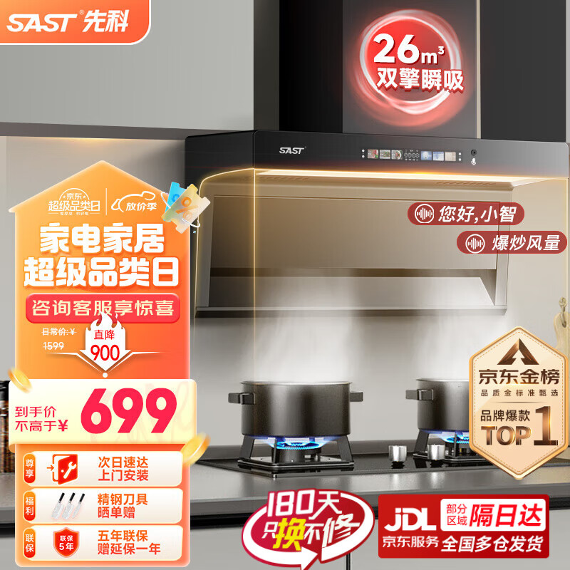 先科(SAST)顶侧双吸抽油烟机燃气灶烟灶套装家用厨房大吸力脱排式7字吸油烟机灶具套装 行业爆款/26立方爆吸+语音+彩屏+大灯价格:1499.00元!