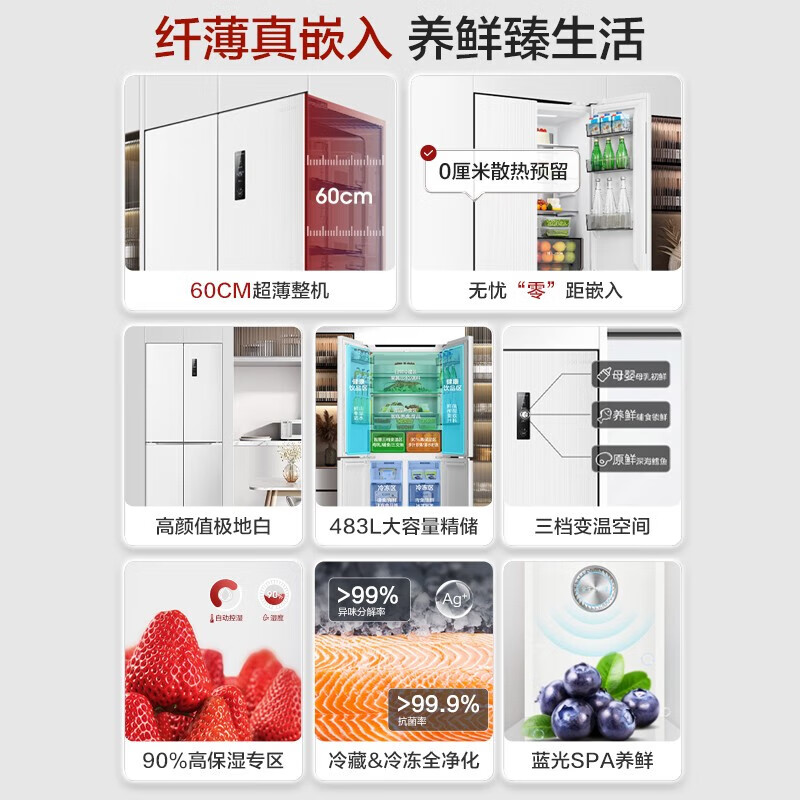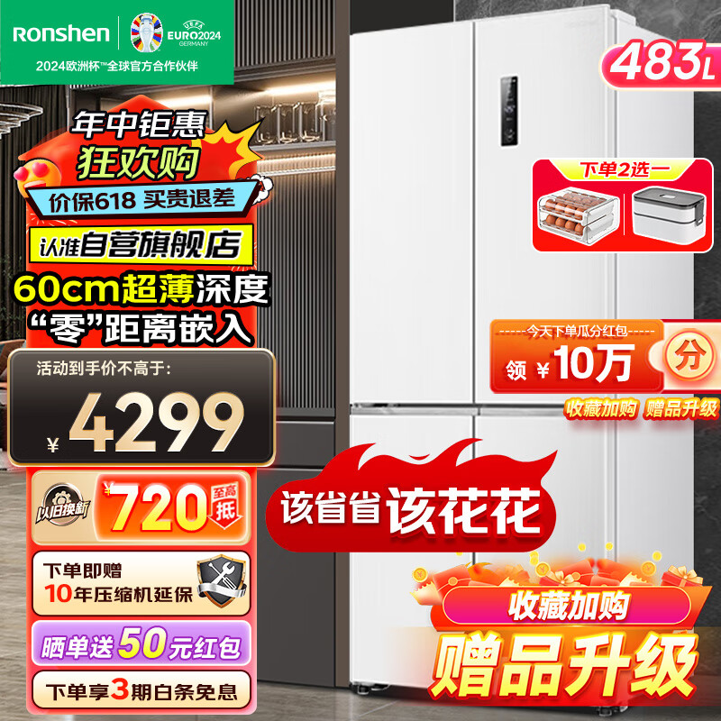 容声(Ronshen)深度60cm平嵌系列483升十字双开四开门一级变频超薄“零”嵌入冰箱BCD-483WD3FPQ极地白[官方直发]价格:4299.00元!