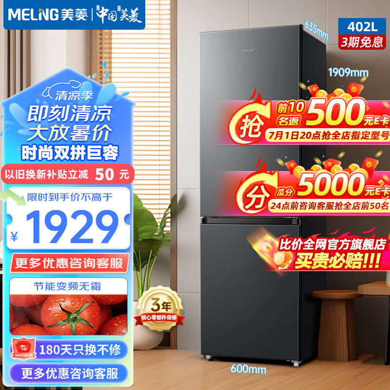 美菱(MeiLing)冰箱402升双门两门冰箱双变频风冷无霜大容量可拼接无缝窄门家用冷藏冷冻电冰箱 BCD-402WPCX典雅灰价格:1929.00元!