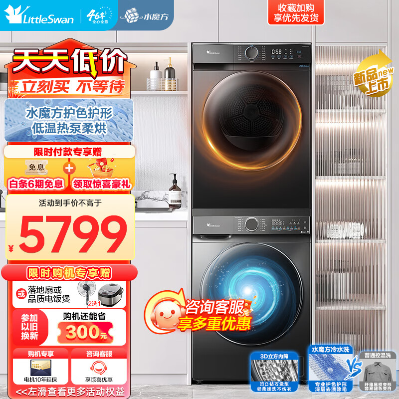 小天鹅(LittleSwan)洗烘套装1.1洗净比 10KG家用滚筒洗衣机 热泵烘干机 水魔方银离子除菌 TG100V868PLUS+TH100VH02T价格:5899.00元!