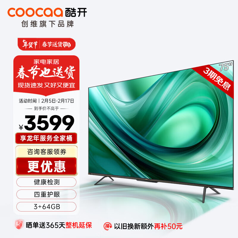 酷开创维 75英寸陪伴屏电视 3+64G 健康检测 防蓝光护眼 视频通话 120Hz高刷智能电视机以旧换新75P60P价格:4999.00元!