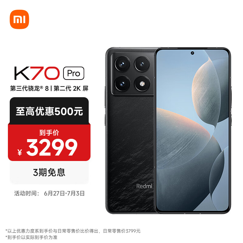 小米Redmi K70 Pro 第三代骁龙8 小米澎湃OS 16GB+512GB 墨羽 红米5G手机 SU7小米汽车互联 AI手机价格:3299.00元!