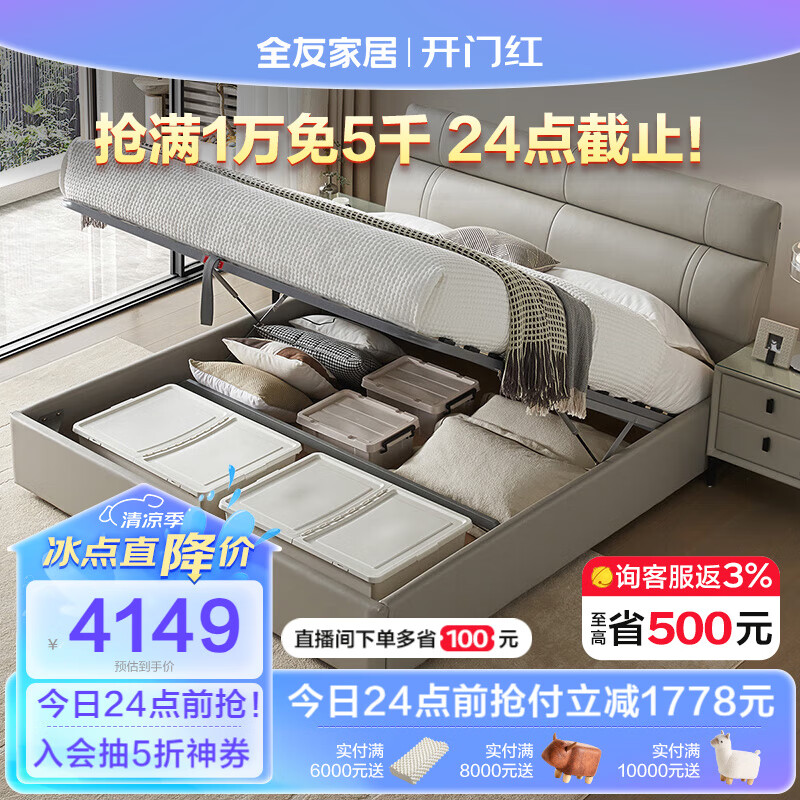 全友家居 真皮艺床头层牛皮现代简约主卧室双人大床高箱储物床105251价格:5927.14元!