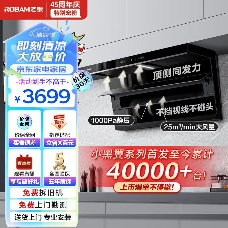 老板(Robam)油烟机顶侧双吸小黑翼侧吸吸油烟机顶吸7字型25风量一级能效脱排抽油烟机家用大吸力27A13-D1价格:3699.00元!