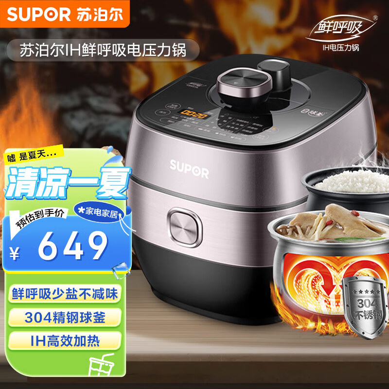 苏泊尔(SUPOR)鲜呼吸IH电锅5L家用智能预约全自动排气顶触控不锈钢球釜SY-50HC8033Q双胆电饭煲高压锅3-6人价格:649.00元!