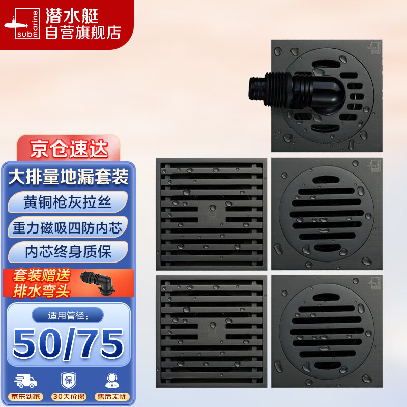 潜水艇(Submarine)黄铜镀镍枪灰色50管防臭地漏套装2个大排量淋浴+2个干湿区+洗衣机价格:568.00元!