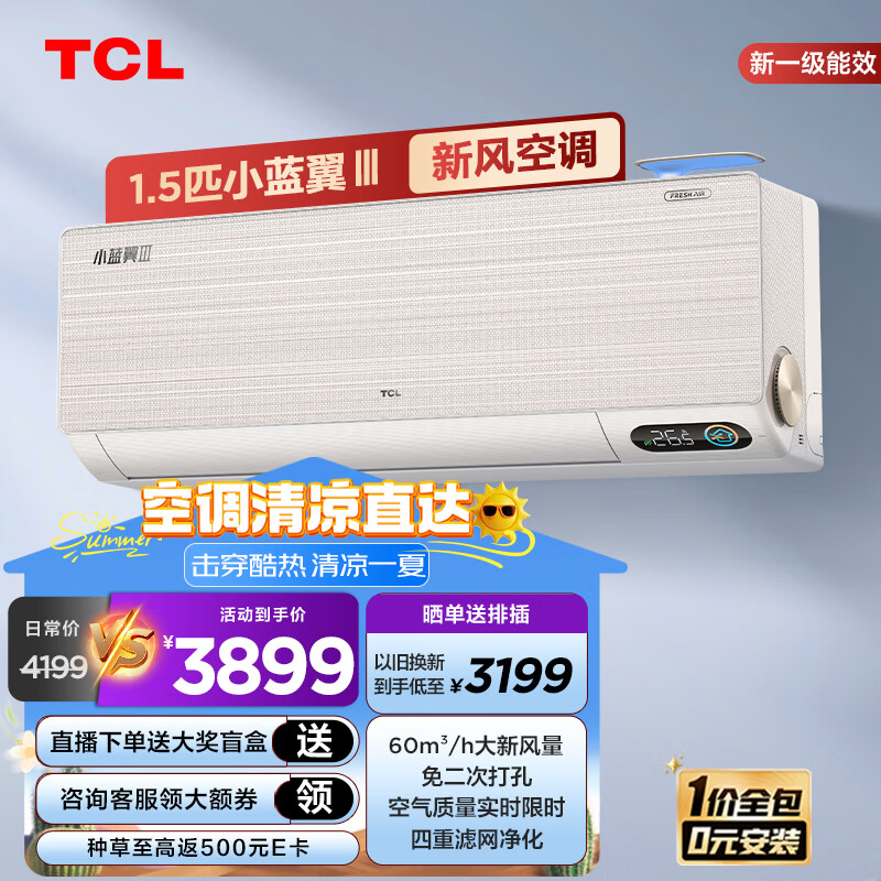 TCL新风空调1.5匹 新一级变频冷暖 60?/h 大新风量 小蓝翼Ⅲ 空调挂机 KFR-35GW/YC1Ca+B1 一价全包价格:3899.00元!
