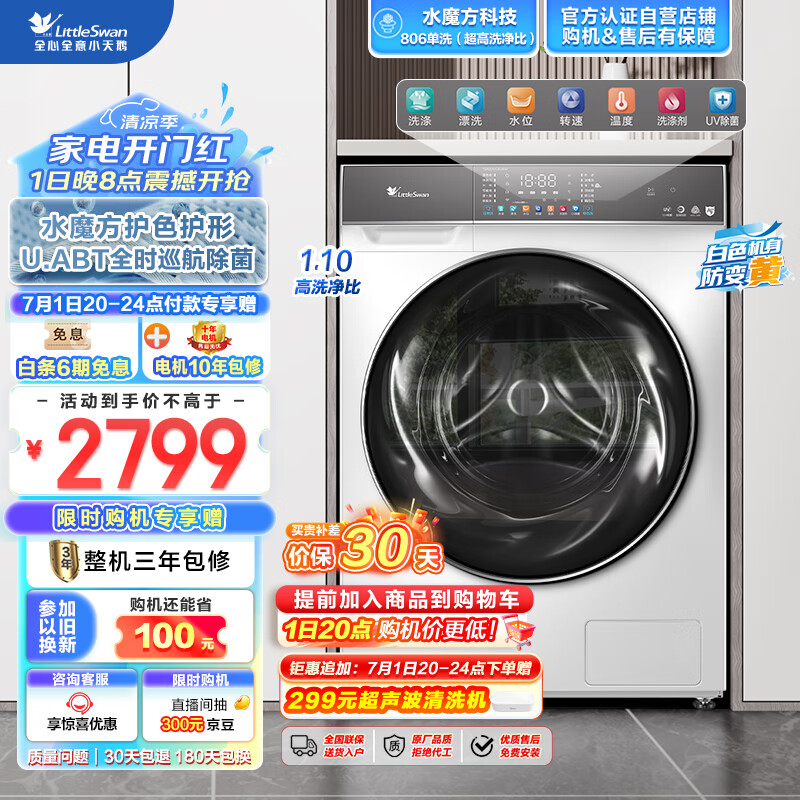 小天鹅(LittleSwan)滚筒洗衣机全自动 10KG大容量超薄白色防变色 水魔方冷水洗 1.1洗净比 彩屏智投除菌 TG100VC806W价格:2999.00元!