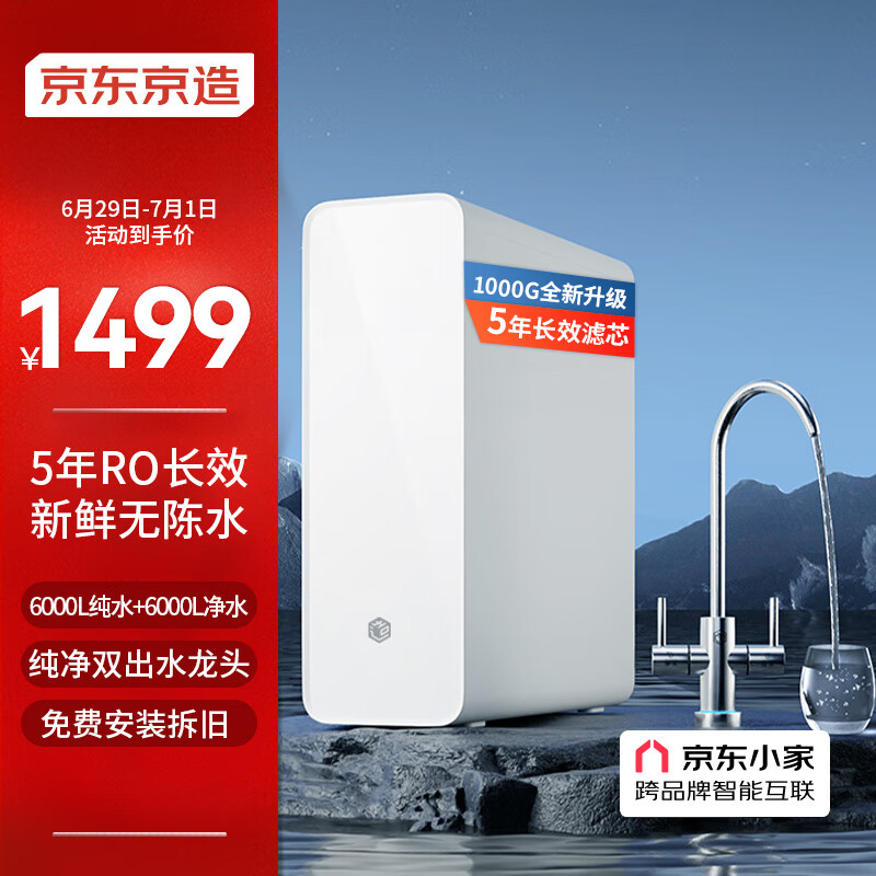 京东京造 零陈水净水器 家用净水机1000GPro 直饮机 过滤器净水器厨下式 5年RO反渗透滤芯 免费安装价格:1799.00元!