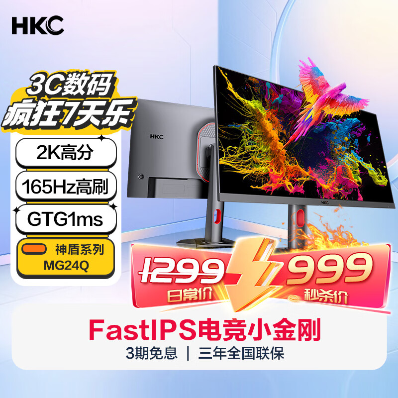 HKC 23.8英寸2K FastIPS 165Hz广色域1ms快速液晶HDR高清屏 旋转升降电竞电脑小金刚显示器 神盾MG24Q价格:1299.00元!