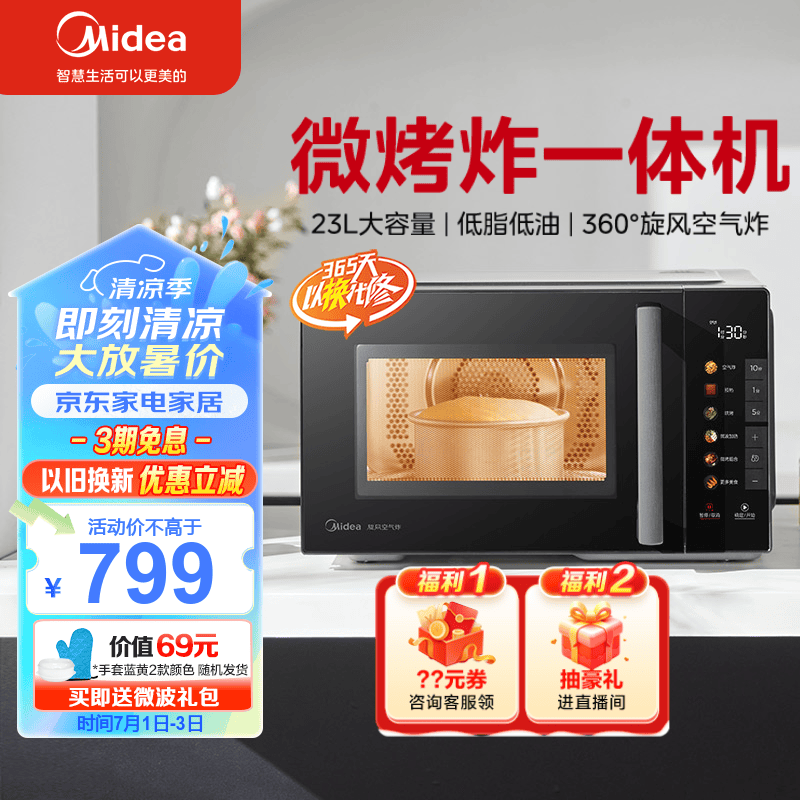 美的(Midea)小旋风空气炸微波炉烤箱一体机 800W变频 不锈钢腔体 智能解冻 低噪音23L(C2F1)价格:799.00元!
