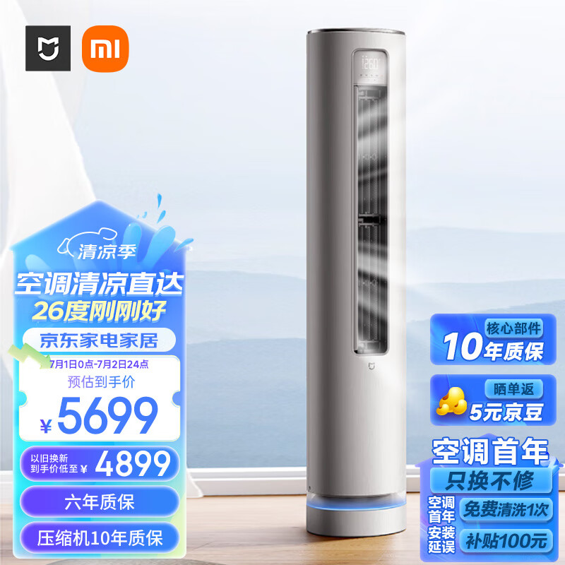 小米3匹 新一级能效 变频冷暖 智能自清洁 客厅圆柱空调立式柜机 米家 KFR-72LW/R1A1价格:5699.00元!
