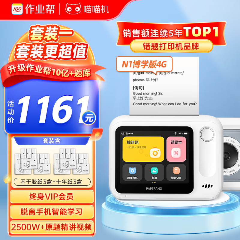喵喵机N1【博学版】高清灰阶作业帮学生错题整理家用热敏可拍照触屏智能学习错题打印机 4G版(套餐一)价格:1059.00元!