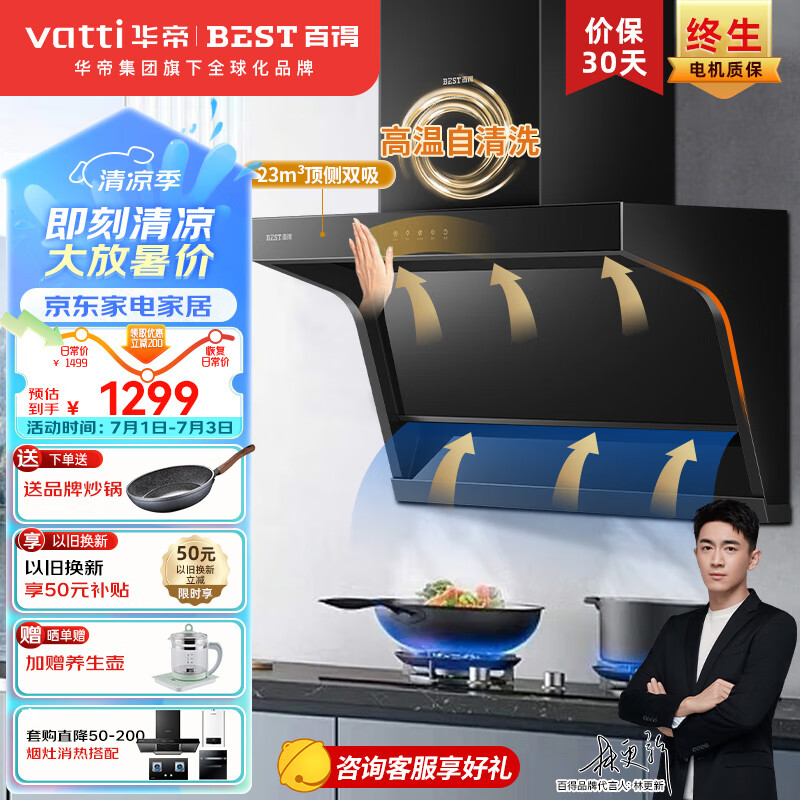 百得(BEST)华帝出品 顶侧双吸油烟机 家用7字型抽油烟机脱排23立方大吸力挥手感应自动洗 CXW-280-E600价格:1349.00元!
