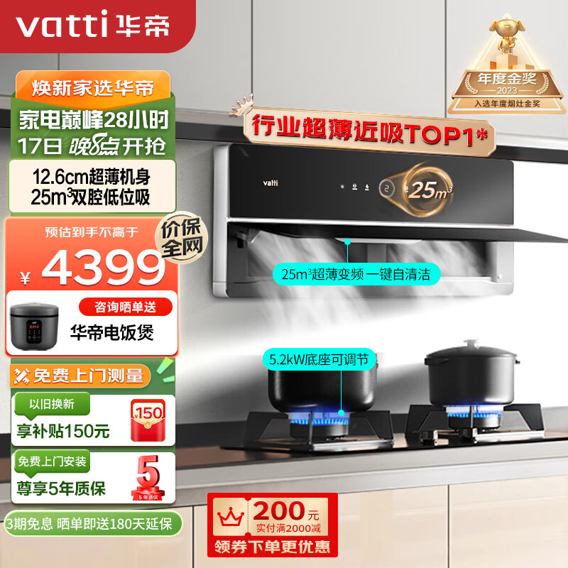 华帝(VATTI)抽油烟机家用变频大吸力超薄近吸烟灶套装25风量自动清洗侧吸燃气灶具套装理想家X6天然气价格:4398.00元!