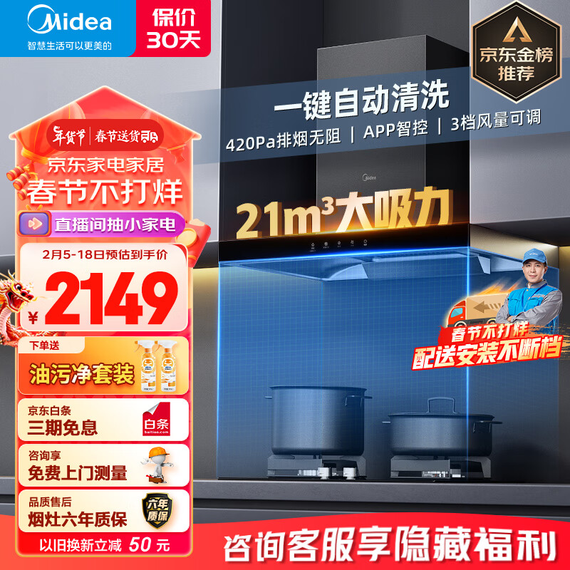 美的(Midea)抽油烟机灶具套装 家用欧式21大风量自动清洗吸烟机 5kW铜火盖燃气灶T201+Q230A天然气价格:2149.00元!