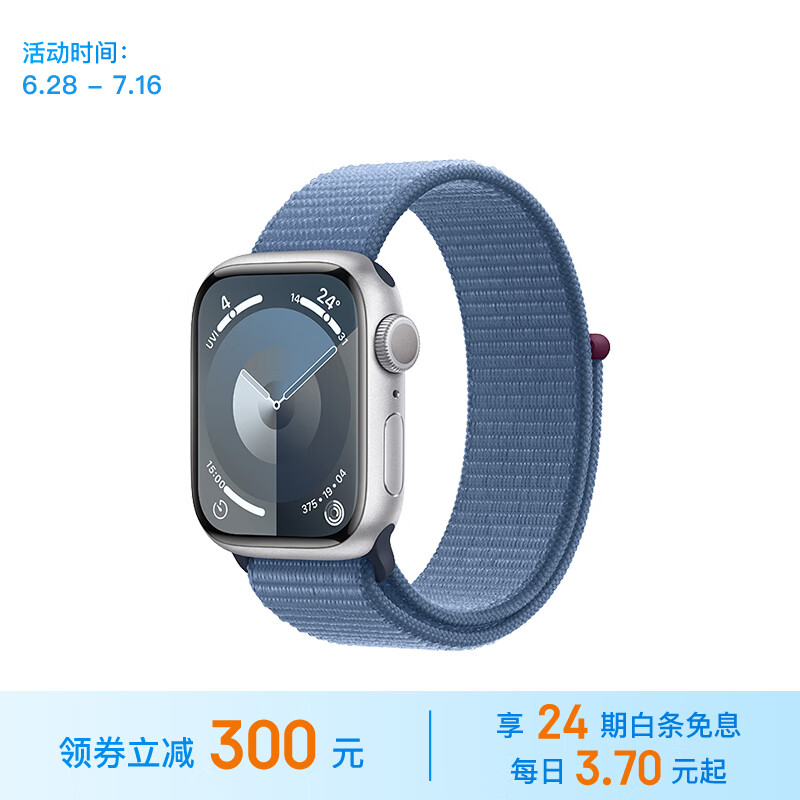 Apple【24期免息】Watch Series 9智能手表GPS款41毫米银色铝金属表壳凛蓝色回环表带MR923CH/A价格:2999.00元!