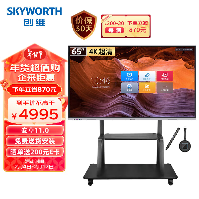 创维(Skyworth)65英寸会议平板一体机 电子白板 无线传屏投影 智能触摸屏电视65DSH5推车+投屏器【商用显示】价格:5869.00元!