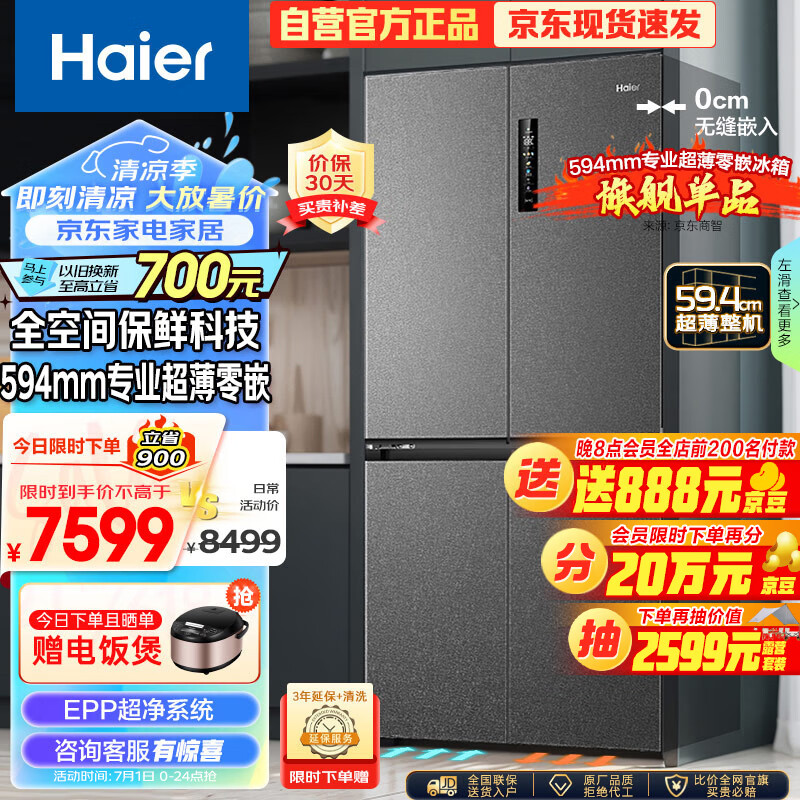 海尔(Haier)518L和景全空间保鲜594mm专业超薄零嵌十字T型四开门家用电冰箱除菌嵌入式BCD-518WGHTD1BSYU1价格:7599.00元!