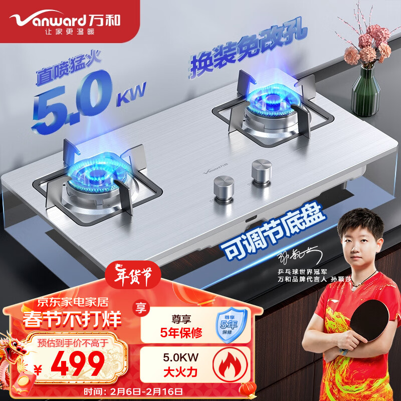 万和(Vanward)燃气灶双灶 天然气灶具5.0kW家用猛火灶台 不锈钢面板台嵌两用 可调节底盘 B7B53天然气价格:497.00元!