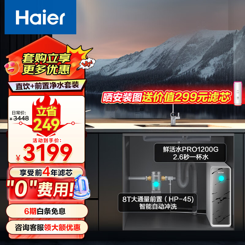 海尔(Haier)净水器1200G鲜活水pro6年RO反渗透厨下直饮3.48L/分钟净水器+前置过滤器HKC3000-R793D2U1+HP45价格:3199.00元!