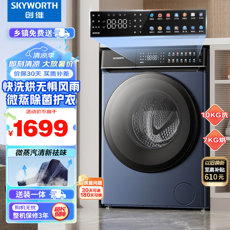 创维(SKYWORTH)10KG变频滚筒洗衣机全自动 洗烘一体机 大容量除螨洗 微蒸空气洗彩屏触控XQG100-B61RBH价格:1699.00元!