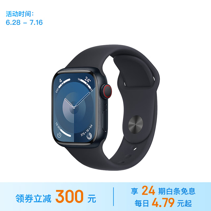 Apple【24期免息】Watch Series 9智能手表蜂窝款41毫米午夜色铝金属表壳午夜色表带M/L MRJJ3CH/A价格:3799.00元!