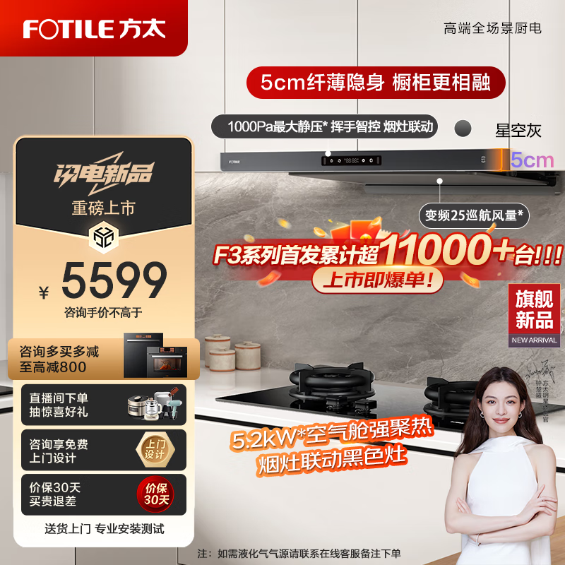 方太(FOTILE)F3纤薄抽吸油烟机灶具套装 欧式顶吸超薄烟机燃气灶25巡航风量变频 空气舱烟灶联动套餐F3-G+TE22价格:5599.00元!