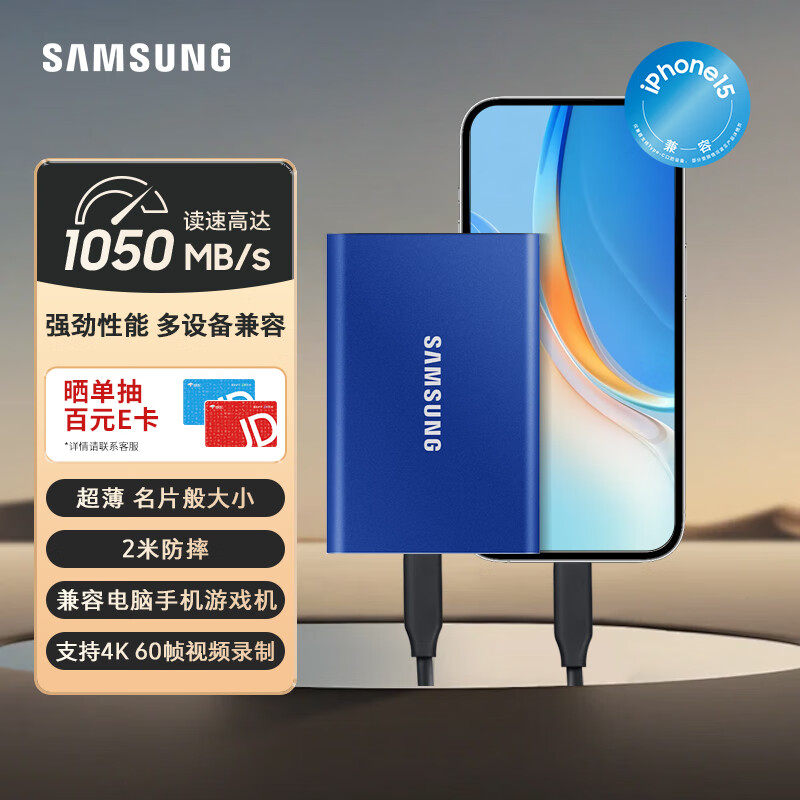 三星(SAMSUNG) 2TB Type-c USB 3.2 移动固态硬盘(PSSD) T7 蓝色 NVMe传输速度1050MB/s 超薄时尚价格:1649.00元!