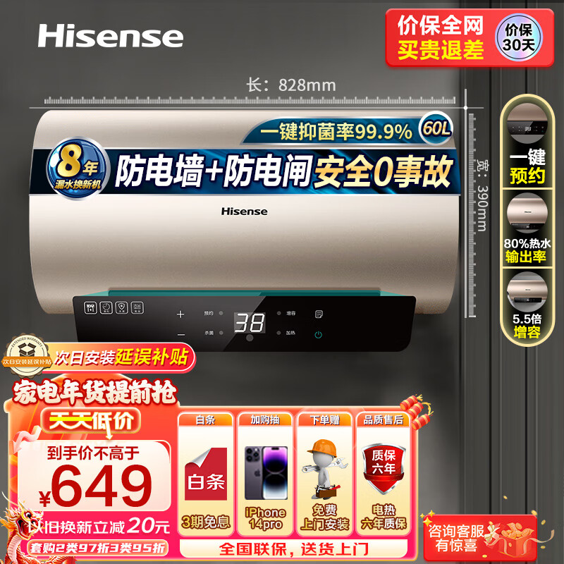 海信(Hisense)60升电热水器家用速热5.5倍增容健康灭菌大屏触控节能省电多重保障DC60-W1513T以旧换新价格:649.00元!