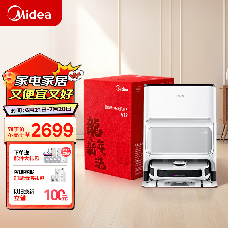 美的(Midea)扫地机器人扫拖一体 灵眸V12极地白【龙年限定礼盒】自动集尘扫拖洗烘一体机洗地机价格:2699.00元!