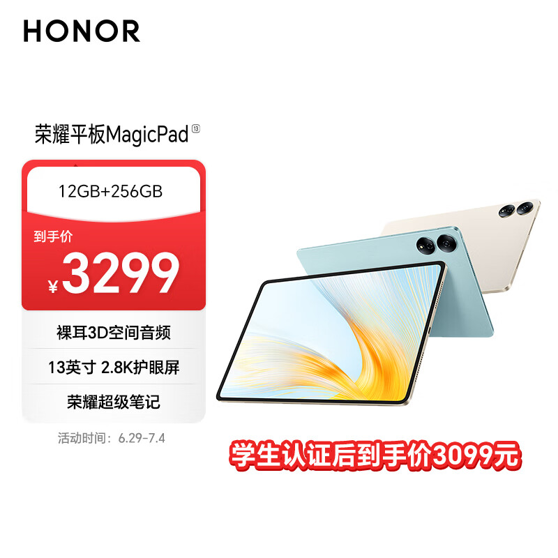 荣耀MagicPad 13英寸平板电脑(12+256GB 2.8K超清 144Hz高刷巨屏 专业级8扬声器 10050mAh)天青色价格:3299.00元!